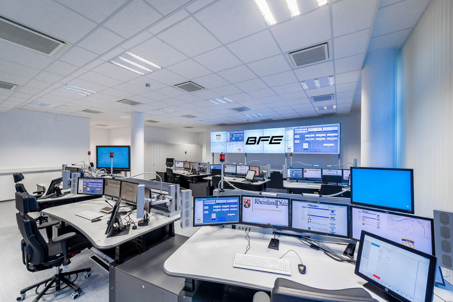 In Rheinland-Pfalz werden große technische und Organisationsentwicklungs-Projekte durchgeführt. Darunter ist auch die Führungs- und Lagezentrale des Polizeipräsidiums Mainz als zentrale Servicedienststelle und Führungseinrichtung für alle Organisationseinheiten sowie Schnittstelle zum Bürger, zu Behörden und Einrichtungen. Zur Anpassung an strukturelle Entwicklungen und neue digitale Techniken wurde eine Erneuerung erforderlich. Daher wurde das Polizeipräsidium Mainz mit der Erarbeitung eines neuen Video- und Visualisierungskonzepts beauftragt, das aktuellen und zukünftigen Anforderungen Rechnung tragen kann. Als Generalunternehmen übernahm BFE die Verantwortung für die Planung, Installation und Inbetriebnahme.